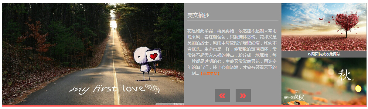這是一款基於javascript實現的三張圖(文)片一起切換的banner焦點圖,帶有左右箭頭,同一個焦點圖,三個位置的圖片可以同時實現切換,圖片中間可以穿插文字說明。