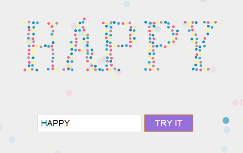 文字散開重組動畫這款特效我們可以在輸入框中指定任意文字,點擊確定按鈕後,就會將原先的文字爆炸散去,新的文字以像素點的形式組合起來,看起來非常棒。
