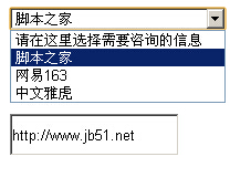 這裡演示下拉菜單和文本框構建的介紹欄,將Select框中的值定位到INPUT文本輸入框中,是下拉框賦值到文本框的實例,上網時候貌似經常見的功能,只是不知如何形容,或許叫做聯動吧。