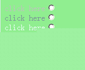 <!DOCTYPE html PUBLIC "-//W3C//DTD XHTML 1.0 Transitional//EN" "http://www.w3.org/TR/xhtml1/DTD/xhtml1-transitional.dtd"> <html xmlns="http://www.w3.org/1999/xhtml"> <head> <meta http-equiv="Content-Type" content="text/html; charset=utf-8" /> <title>radio顏色選擇器</title> <body> <FORM METHOD="POST" NAME="bgcolor"> <font color="silver">click here</font><input type="radio" name="bgcolor" ONCLICK="document.bgColor='silver'"><BR> <font color="lightslategray">click here</font><input type="radio" name="bgcolor" ONCLICK="document.bgColor='lightslategray'"><BR> <font color="azure">click here</font><input type="radio" name="bgcolor" ONCLICK="document.bgColor='azure'"><BR> <font color="lightgreen">click here</font><input type="radio" name="bgcolor" ONCLICK="document.bgColor='lightgreen'"><BR> <font color="lightblue">click here</font><input type="radio" name="bgcolor" ONCLICK="document.bgColor='lightblue'"><BR> <font color="white">click here</font><input type="radio" name="bgcolor" ONCLICK="document.bgColor='white'"><BR> </form> </body> </html>