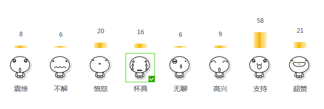 接下來,我們有個交互動作,當點擊對應的心情圖標時,圖標被標識為已發表,柱狀圖高度發生變化,並且上面的數字會+1,表示發表成功,如果繼續點擊心情圖標,會提示已經發表過不能重復提交。請看代碼: