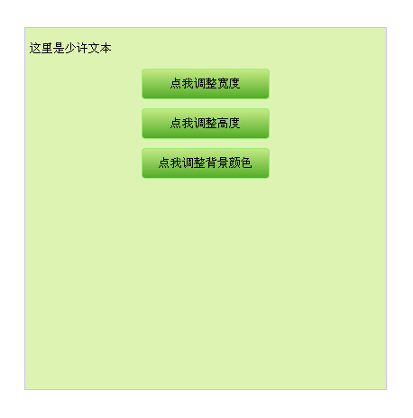 這裡使用JavaScript實現點擊按鈕後改變DiV的高度、寬度和背景色等,點擊對應按鈕,Div調整高度、調整寬度、調整背景色等。實現方面主要是使用JS來控制點擊按鈕後改變CSS樣式文件,這一切都是在JS的動態控制下,比如無刷新切換網頁風格的實現,可以以此為基礎來擴展。