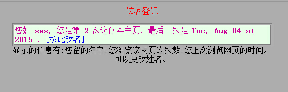 <font class=30pt>顯示的信息有:您留的名字;您浏覽該網頁的次數;您上次浏覽網頁的時間。可以更改姓名。