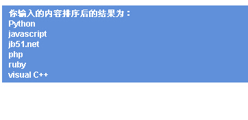 document.write("你輸入的內容排序後的結果為:<br>"+user_inputs.join("<br>"));
