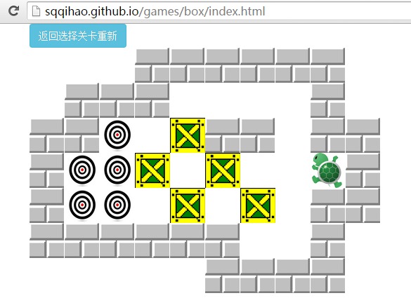 有一個很重要的東西就是推箱子游戲的主要邏輯:因為小烏龜走的地方只能是空白的區域,而且烏龜前面有牆就不能走, 或者烏龜前面是箱子,就再判斷箱子前面是否有牆, 如果沒有牆烏龜和箱子都可以走往前走一步,如果有牆就不能走。每一次小烏龜走了都改變地圖數據,然後重新生成界面,如此循環, 每一小烏龜走完都要檢測地圖數據中的箱子數據是否全對上了,對上了就給用戶提示, 並進入下一關;