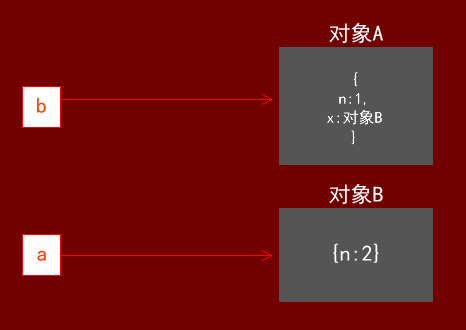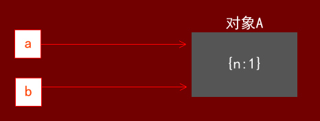 在這裡a指向了一個對象{n:1}(我們姑且稱它為對象A),b指向了a所指向的對象,也就是說,在這時候a和b都是指向對象A的: