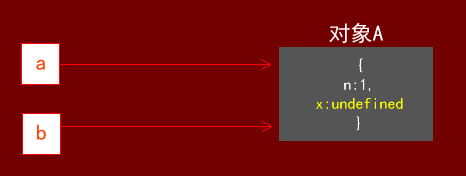 這時候發生了這個事情——a指向的對象{n:1}新增了屬性x(雖然這個x是undefined的):