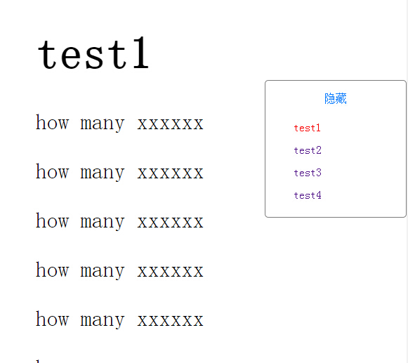 寫完之後,預覽一下,點擊菜單,跳入指定章節,同時點擊項變紅色,刷新當前頁面,依賴顯示正確。滑動一下滾輪,菜單項隨著內容的變化而相應的變化,拖動一下滾動條,也是這樣,最後點擊一下隱藏,菜單縮回去,點擊顯示,菜單滑出來。這樣懸浮功能就做完了。