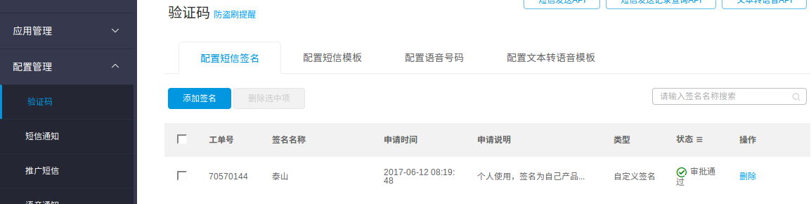sms_free_sign_name: '泰山',//你在阿裡大於的應用名