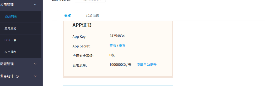 4應用列表裡===》操作一欄===》點擊設置 記住 app key 和 APP sercret