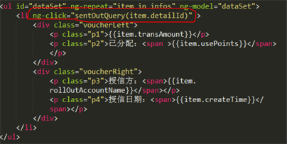 ng-click="sentOutQuery('{{item.detailId}}')" 這樣雖然在頁面上debugger能看到傳的參數值,但是這樣事件點擊無效,如下圖;