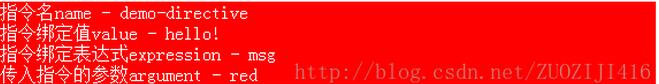 下面將講解一個使用鉤子函數參數的例子,將元素的字體色設置為#fff,將背景色設置為傳入指令的參數red,並將指令名,指令綁定值,指令綁定值的表達式,傳入指令的參數顯示在<div>中。