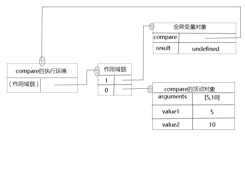 對於上述代碼而言,全局執行環境的變量對象(再次聲明:每一個執行環境都存在相應的變量對象)中包含result和compare,該變量對象在compare()執行環境的作用域鏈的第二位。