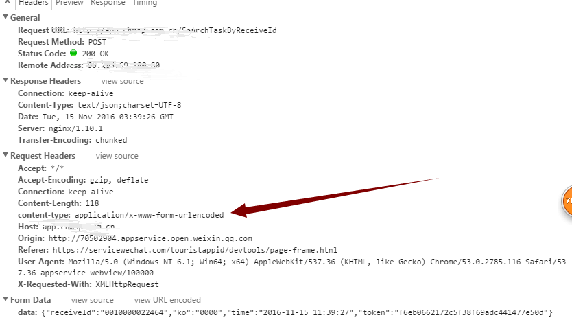 其中header 中的Content-Type,應該用小寫content-type才能讓服務器收到參數。讓我折騰的好久,改了服務器仍然不行,原來是這個問題。參數在request payload中,服務器不能收到,使用如下轉換之後