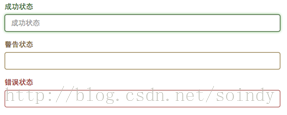 <form role="form"> <div class="form-group has-success"> <label class="control-label" for="inputSuccess1">成功狀態</label> <input type="text" class="form-control" id="inputSuccess1" placeholder="成功狀態" > </div> <div class="form-group has-warning"> <label class="control-label" for="inputWarning1">警告狀態</label> <input type="text" class="form-control" id="inputWarning1" placeholder="警告狀態"> </div> <div class="form-group has-error"> <label class="control-label" for="inputError1">錯誤狀態</label> <input type="text" class="form-control" id="inputError1" placeholder="錯誤狀態"> </div> </form>