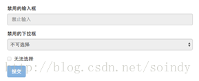 <form role="form"> <fieldset disabled> <div class="form-group"> <label for="disabledTextInput">禁用的輸入框</label> <input type="text" id="disabledTextInput" class="form-control" placeholder="禁止輸入"> </div> <div class="form-group"> <label for="disabledSelect">禁用的下拉框</label> <select id="disabledSelect" class="form-control"> <option>不可選擇</option> </select> </div> <div class="checkbox"> <label> <input type="checkbox">無法選擇 </label> </div> <button type="submit" class="btnbtn-primary">提交</button> </fieldset> </form>