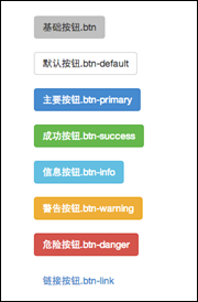<button class="btn" type="button">基礎按鈕.btn</button> <button class="btn btn-default" type="button">默認按鈕.btn-default</button> <button class="btn btn-primary" type="button">主要按鈕.btn-primary</button> <button class="btn btn-success" type="button">成功按鈕.btn-success</button> <button class="btn btn-info" type="button">信息按鈕.btn-info</button> <button class="btn btn-warning" type="button">警告按鈕.btn-warning</button> <button class="btn btn-danger" type="button">危險按鈕.btn-danger</button> <button class="btn btn-link" type="button">鏈接按鈕.btn-link</button>