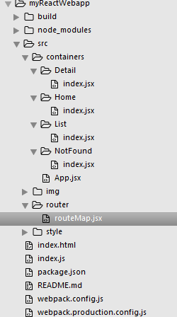 這是項目的目錄結構,主要的代碼都在src目錄下,src下面新建一個containers文件夾放我們的一些組件,router文件夾是配置路由用的。