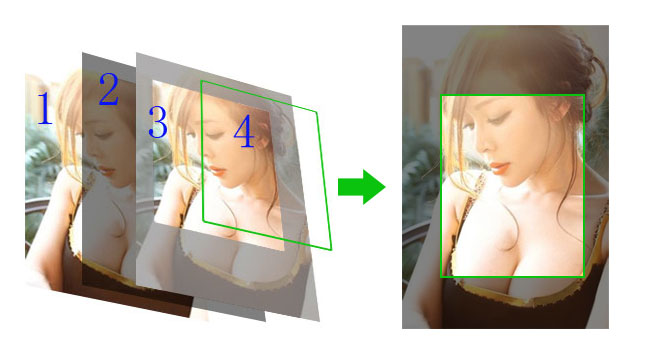 將效果圖分為左右兩部分,先看左邊,由一張圖片加一個矩形選區組成,圖片和選區之間有一層半透明的遮罩,但是這樣的話會連選區部分一塊遮住,就沒有上面這種框選出來的效果了,事實上結構是這樣的:由下往上分別是1圖片層,2遮罩層,3選區層(一個div,絕對定位),4圖片層(絕對定位)。第1層和第4層的圖片是一樣的,大小及left、top值也一樣,給第3層選區層加個overflow:hidden,就呈現出了上面的效果,虛線邊框及拖拽的8個點後文會講到。下圖比較直觀地說明的它們的層級關系,第3層灰色部分為overflow:hidden隱藏的部分: