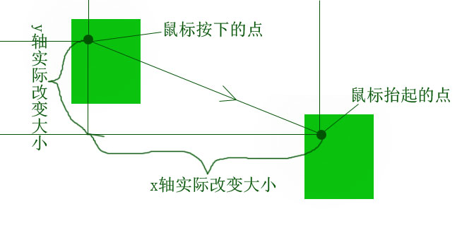 每個部分裡的點觸發的事件是一樣的,4個部分觸發的事件都是改變選區大小,不一樣的地方在於第1部分會同時改變選區的left和top值,第2和第4部分分別只改變的是選區的top、left值,第3部分不會改變選區的left和top值。4個部分原理都一樣,拿第1部分說事,點擊第1部分的點往左上角拖動,選區變大的同時設置其left和top值(會減小),而left減小的值剛好等於選區增大的值,這個值的計算方法同拖拽原理。拖拽過程中需要限制范圍,不能超出整個圖片的范圍。