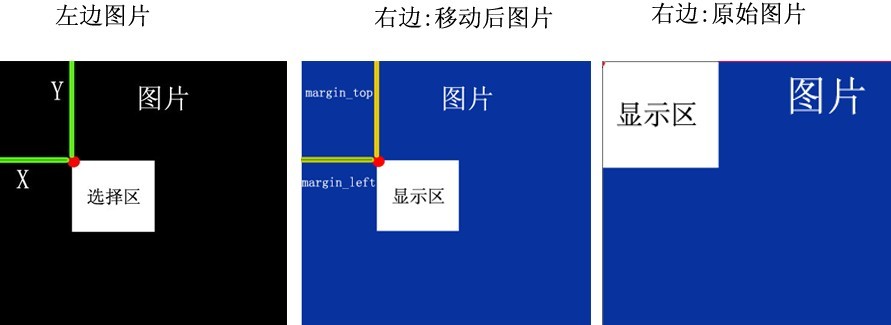 上圖中:黑色:圖片,白色:選擇區,紅色:起始點,綠色:起始點的橫縱坐標值; 黃色為:右邊圖片的margin-top,margin-left