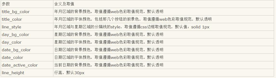 calendar_init函數的第二個參數是可選項,類型是包含鍵值對的對象,下面用表格介紹下這個參數的每個鍵的含義及其取值: