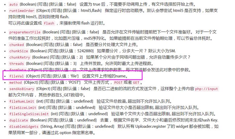 當我我給他接口不傳參數的時候上傳文件,他那裡看到的tomcat日志打印出來了三個參數,分別是file,fileContentType,fileFileNamez這三個參數,file這個參數經過調試,是我傳過去的文件,然後我們就猜測是不是有一個默認參數叫做“file”,去webuploader這個api中經過搜索證明了我們的猜測是正確的,如下圖: