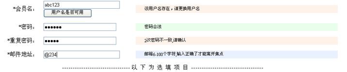 實際項目中比較常用的(JQuery+AJAX+MD5),屬於即時驗證,亮點是驗證用戶是否存在的那一項,具體內容如下
