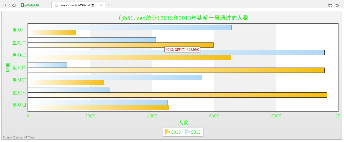 <chart caption='(jb51.net統計)2012和2013年某橋一周通過的人數' xAxisName='星期' yAxisName='人數' showValues='0'