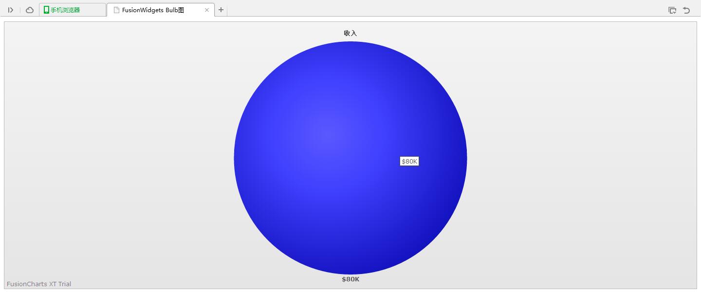 <?xml version="1.0" encoding="UTF-8"?> <chart lowerLimit="0" upperLimit="100" caption="收入" numberPrefix="$" numberSuffix="K" showValue="1"> <colorRange> <color minValue="0" maxValue="10" code="AA8989"/> <color minValue="10" maxValue="20" code="549485"/> <color minValue="20" maxValue="30" code="666666"/> <color minValue="30" maxValue="40" code="786767"/> <color minValue="40" maxValue="50" code="BB7878"/> <color minValue="50" maxValue="60" code="FF0000"/> <color minValue="60" maxValue="70" code="00FF00"/> <color minValue="70" maxValue="100" code="0000FF"/> </colorRange> <value>80</value> <target>82</target> </chart>