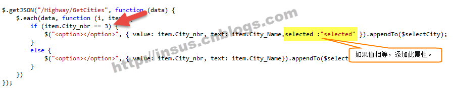 如果你需要在顯示時,綁定一個選擇值,那怎樣實現呢?很簡單的,在$.each時,判斷一下: