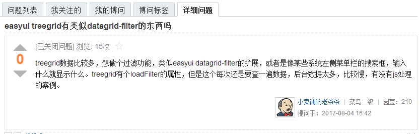 期間我也看了下網上的解決方法,不知道是不是太簡單了,網上關於TreeGrid過濾的資源很少。博問裡也都被大牛無視了。