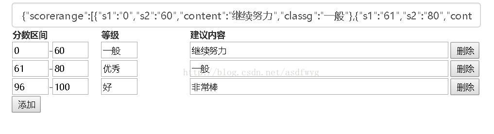 實現效果如下,在編輯表格的同時可以實現字段json內容的自動變化,點擊提交可以保存到後台,頁面加載的時候自動解析json並加載表格內容。該代碼解析和加載功能都用前端js實現,簡化了後台代碼邏輯。
