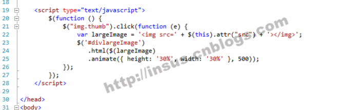 本篇中,可以學到jQuery的click事件。使用標簽.樣式類獲取對象(img.thumb)。使用$(this)來代碼對象本身。.attr("scr")獲取圖片src圖片路徑。還有一個就是.animate()動態事件。