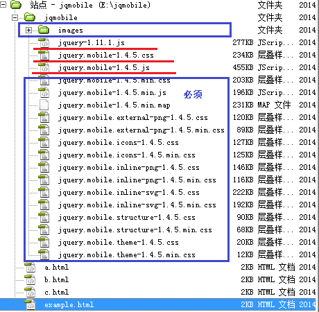 首先要在jQueryMobile(點擊此處本站下載)下載一個壓縮包,然後把這個壓縮包的所有內容拉到你的站點文件夾,雖然在網頁僅僅是引用jquery.mobile-1.4.5.js與jquery.mobile-1.4.5.css,但是其他的輔助文件除了說明文檔demo文件夾外缺一不可。即使它的js文件與css文件,但它不像Bootstrap一樣,把所有功能集成到一個js裡面,如果缺乏某些文件夾,某些圖標可能無法顯示。而且,請把原根文件夾jquery.mobile-1.4.5的名字改成jqmobile或者其他,反正文件夾中別有.-這些標點符號,否則,在網頁中引用jquery.mobile-1.4.5.js與jquery.mobile-1.4.5.css可能失效。