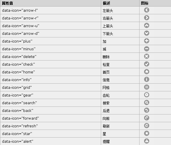 其中w3cschool上對於主題的論述有些過時,請注意,最新版本的jQueryMobile的自帶主題刪得只剩下兩種。jQueryMobile的自帶圖標如下: