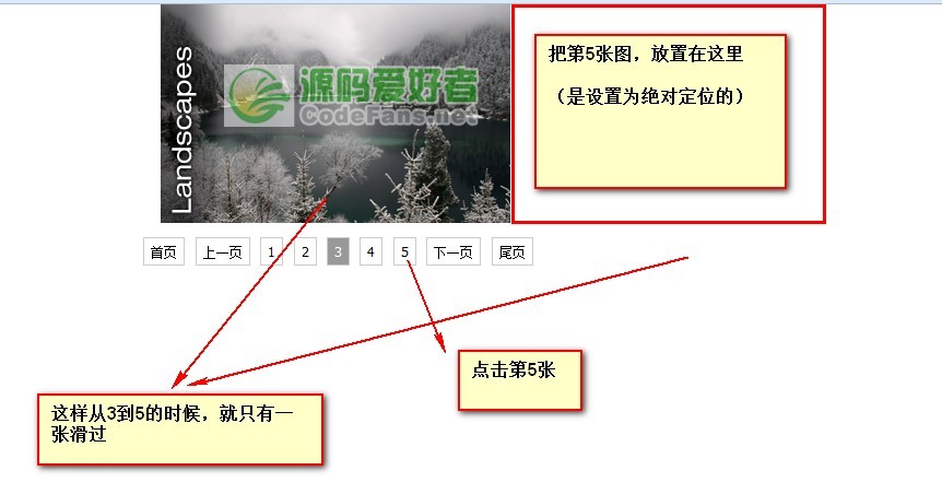【處理】 這裡的圖片滾動輪播,做了點小處理:當在第1頁狀態時,你點擊第5頁,圖片的滾動是一張滑過,而不是從2-3-4-5(這種的多張滾動,看得頭暈眼花);