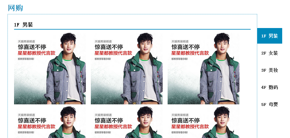 單頁面網頁內容較多,頁面長度較大,需要方便快速的在頁面的不同位置進行定位,所以浮動菜單逐漸流行了起來,如下圖 男裝、女裝、美妝等。