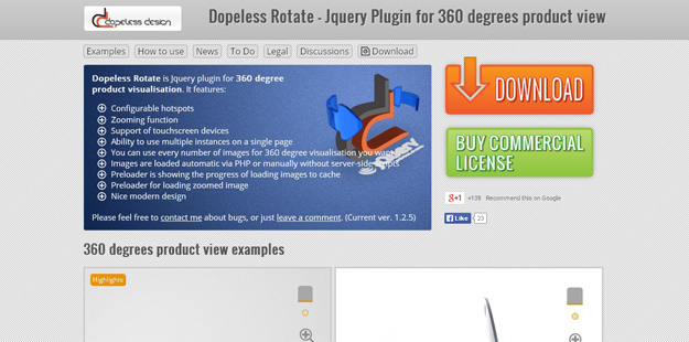 Dopeless Rotate 是款 jQuery 插件,用來進行圖像的 360 度旋轉展示,它包括縮放功能,支持觸摸設備,允許在同一個頁面使用多個插件。