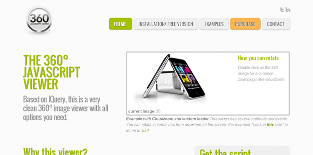 Super Tiny jQuery 360 Degree Product Viewer 是個超輕量級的(只有 27 行 javaScript 代碼,約為 1 kb)。這是個非常容易使用的 jQuery 插件,允許用戶通過移動鼠標來從 360 度來展示圖像。
