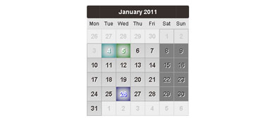 是一款外觀比較華麗的HTML5/CSS3日歷應用,這款日歷應用的特點是擁有非常酷的日期選擇效果,鼠標滑過日期時即會有立體的背景展現出來,相比之前分享的HTML5/CSS3帶日期區間的日期選擇插件,雖然功能上稍遜一籌,但總體來講還是非常實用的一款HTML5日歷的。