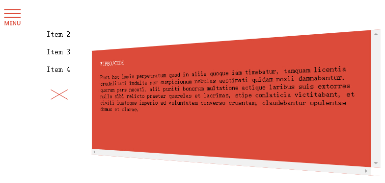 <div style="position: relative; height: 400px; width: 825px; margin: auto;"> <div class="contener"> <div id="corp_page" style="overflow: scroll"> <div style="width: 100%"> <table align="center" border="0" cellpadding="0" cellspacing="0" width="100%"> <tbody> <tr> <td style="padding: 10px; font-weight: 100; color: #ffffff;" valign="top"> WIFEO/CODE </td> </tr> <tr> <td style="padding: 10px;" valign="top"> Post hoc impie perpetratum quod in aliis quoque iam timebatur, tamquam licentia crudelitati indulta per suspicionum nebulas aestimati quidam noxii damnabantur. quorum pars necati, alii puniti bonorum multatione actique laribus suis extorres nullo sibi relicto praeter querelas et lacrimas, stipe conlaticia victitabant, et civili iustoque imperio ad voluntatem converso cruentam, claudebantur opulentae domus et clarae. </td> </tr> </tbody> </table> </div> </div> </div> <div class="menu"> Item 2<br /> <br /> Item 3<br /> <br /> Item 4<br /> <br /> <img id="btn_menu_close" src="2.png" style="cursor: pointer;" /></div> <div style="top: 0; left: 0; position: absolute; cursor: pointer;"> <img id="btn_menu" src="1.png" /> </div> </div>