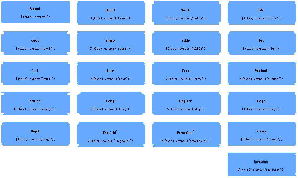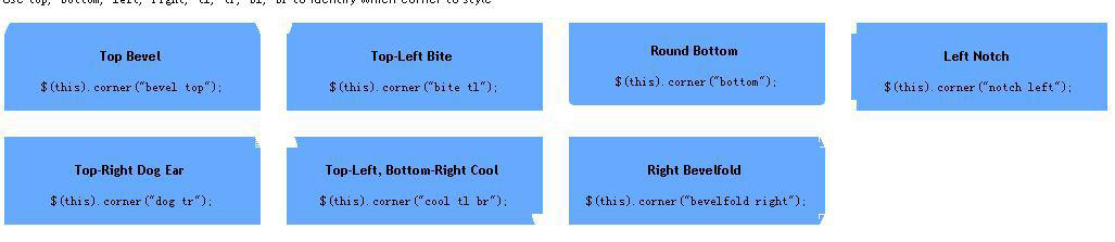 但有兩句話需要大家注意(原文):* Fold lines are not supported in Internet Explorer for pages rendered in quirksmode.* Fold lines are only supported on top corners in Internet Explorer, unless running in IE8 standards-mode. 所以,盡量老老實實地用Corner樣式吧。 二、有多種位置可選 可以使用top/bottom/left/right/tl/tr/bl/br設置corner出現的具體位置。看圖: