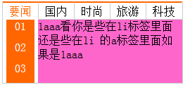 <div id="all"> <div id="title"> <ul><li>要聞</li><li>國內</li><li>時尚</li><li>旅游</li><li>科技</li></ul> </div> <div id="content"> <div style="clear:both;" class="info"> <ul><li>01</li><li>02</li><li>03</li></ul> <div> <div class="inContent">1aaa看你是些在li標簽裡面還是些在li 的a標簽裡面如果是1aaa</div> <div class="inContent">1bbb看你是些在li標簽裡面還是些在li 的a標簽裡面如果是1bbb</div> <div class="inContent">1ccc看你是些在li標簽裡面還是些在li 的a標簽裡面如果是1ccc</div></div> </div> <div class="info"> <ul><li>01</li><li>02</li><li>03</li></ul> <div> <div class="inContent">2aaa看你是些在li標簽裡面還是些在li 的a標簽裡面如果是1aaa</div> <div class="inContent">2bbb看你是些在li標簽裡面還是些在li 的a標簽裡面如果是1bbb</div> <div class="inContent">2ccc看你是些在li標簽裡面還是些在li 的a標簽裡面如果是1ccc</div></div> </div> <div class="info"> <ul><li>01</li><li>02</li><li>03</li></ul> <div> <div class="inContent">3aaa看你是些在li標簽裡面還是些在li 的a標簽裡面如果是3aaa</div> <div class="inContent">3bbb看你是些在li標簽裡面還是些在li 的a標簽裡面如果是3bbb</div> <div class="inContent">3ccc看你是些在li標簽裡面還是些在li 的a標簽裡面如果是3ccc</div> </div> </div> <div class="info"> <ul><li>01</li><li>02</li><li>03</li></ul> <div> <div class="inContent">4aaa看你是些在li標簽裡面還是些在li 的a標簽裡面如果是4aaa</div> <div class="inContent">4bbb看你是些在li標簽裡面還是些在li 的a標簽裡面如果是4bbb</div> <div class="inContent">4ccc看你是些在li標簽裡面還是些在li 的a標簽裡面如果是4ccc</div> </div></div> <div class="info"> <ul><li>01</li><li>02</li><li>03</li></ul> <div> <div class="inContent">5aaa看你是些在li標簽裡面還是些在li 的a標簽裡面如果是5aaa</div> <div class="inContent">5bbb看你是些在li標簽裡面還是些在li 的a標簽裡面如果是5bbb</div> <div class="inContent">5ccc看你是些在li標簽裡面還是些在li 的a標簽裡面如果是5ccc</div> </div></div> </div> </div>