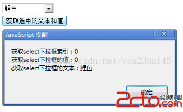 alert("獲取select下拉框索引:" + index + "\n" + "獲取select下拉框的值:" + selectVal + "\n" + "獲取select下拉框的文本:" + selectText);