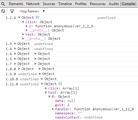 我們要說的重點是怎麼定位到事件源碼處。因為jQuery版本眾多,而且重構過多次,所以要分情況來說了。