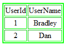 var html = "<table border='2px' style='text-align:center;border-style:solid;border-width:2px;border-color:#00ff00;'><tr><td>UserId</td><td>UserName</td></tr>";