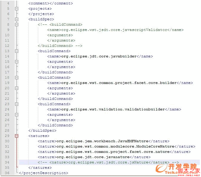 在該工程根目錄下,找到 .project文件,用文件編輯器打開,將<buildSpec>節點下的<name>值為org.eclipse.wst.jsdt.core.javascriptValidator的<biildCommand>刪除,之後再將<natures>節點下值為org.eclipse.wst.jsdt.core.jsNature的<nature>刪除即可。如圖:(綠色部分)