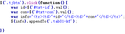 我先通過變量獲取值,接著建了一個html標簽,然後appendTo到table裡,這樣,大家就可以看到數據的插入了,當然,這不是數據庫。。。大家記得,借助於juqery ui,一個dialog,我們就能實現拖動式彈窗了。。。