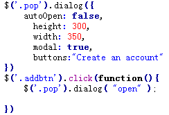 我們可以看到,我對pop這個div,實現的方式是讓它不要autoopen,點擊的時候,我只要一句dialog,open就搞定了,借助於jquery ui,我們做彈窗就是這麼簡單。。。當然了,大家可以看到,我還有一個插入數據的功能,這個功能,我采用了jquery 的appendto: